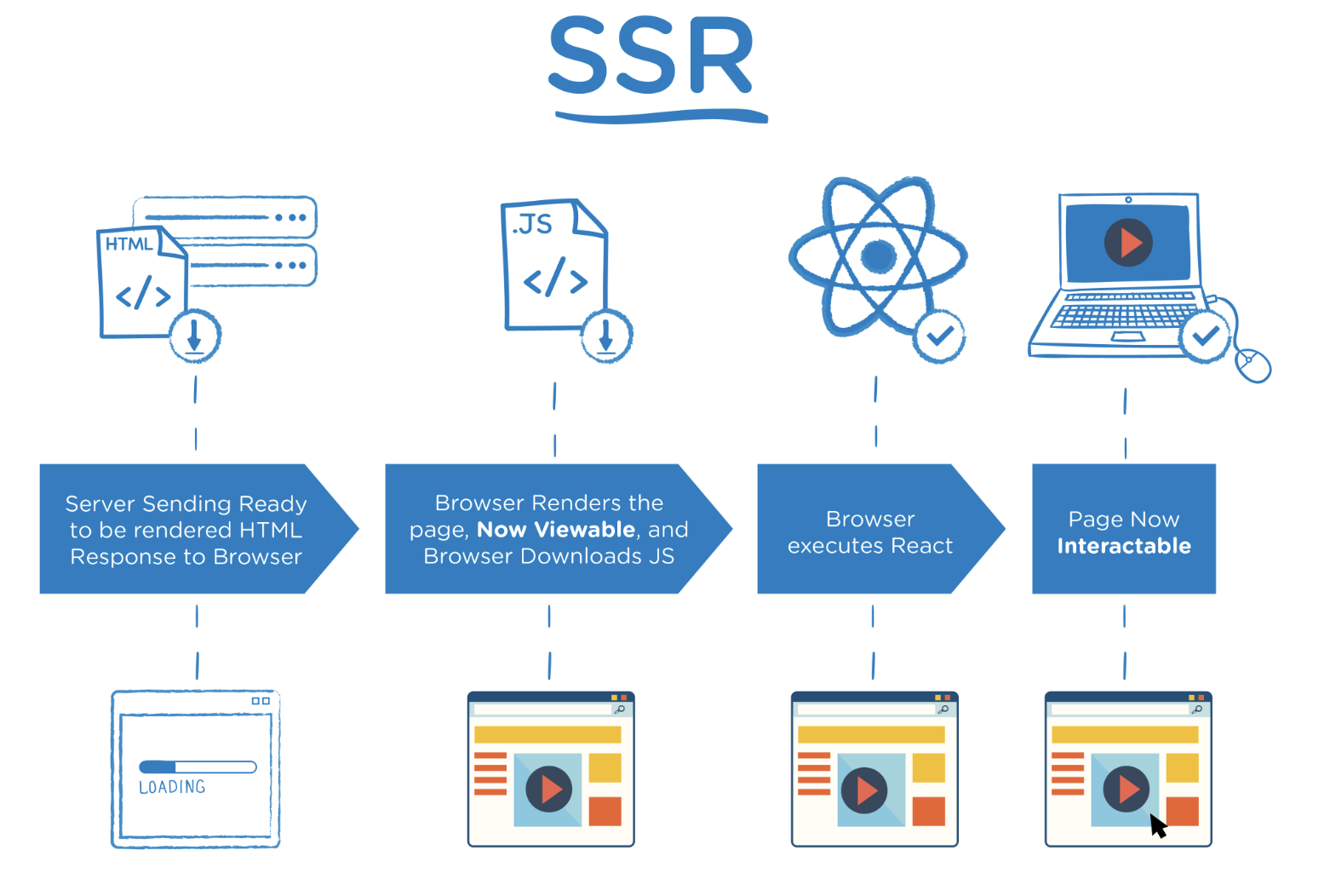 따라서 SSR 은 초기 로딩 속도가 빠르며, 완성된 html 이 오기 때문에 SEO에도 CSR 보다 유리하다. 하지만 요청에 대해 서버에서 새로 렌더링 해야하므로 서버에 부하가 있을 수 있고, 먼저 html을 보여주고 이 후에 hydration 하기 때문에 사용자와의 상호작용하는 데 딜레이가 있게 된다.